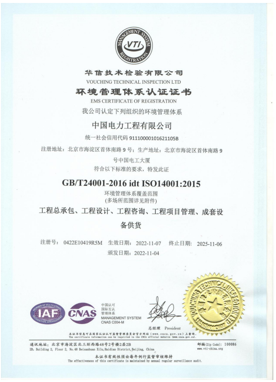 ??????? 為了進一步提高企業經營、管理和服務水平,接軌國際標準化管理要求,中國電力工程有限公司于2019年展開了ISO三合一體系的認證準備工作,并順利通過了審核,獲得了華信技術檢驗有限公司頒發的ISO9001質量管理體系認證證書、ISO14001環境管理體系認證證書以及ISO45001職業健康安全管理體系認證證書。